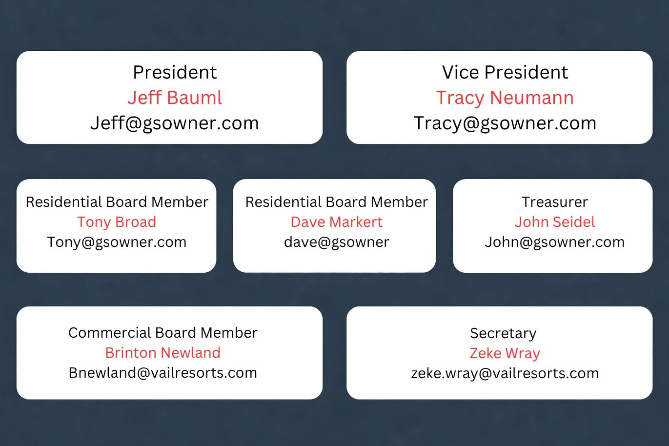 Your volunteer Executive Board is here to manage our mutual investment in the Grand Summit Hotel. Feel free to contact us with your comments and suggestions.